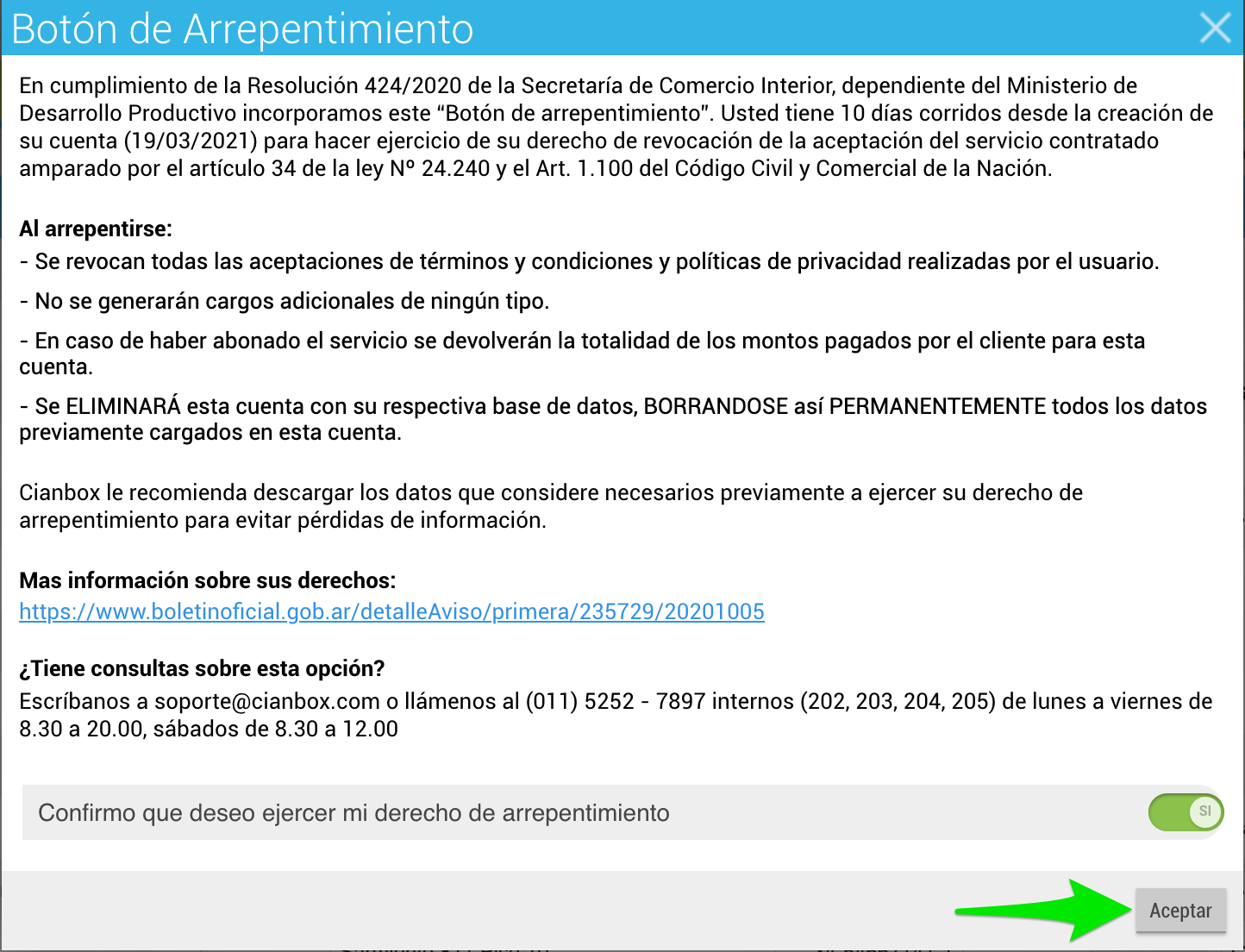 En cumplimiento de la Resolución 424/2020 de la Secretaría de Comercio Interior, dependiente del Ministerio de Desarrollo Productivo incorporamos este “Botón de arrepentimiento”. Usted tiene 10 días corridos desde la creación de su cuenta para hacer ejercicio de su derecho de revocación de la aceptación del servicio contratado amparado por el artículo 34 de la ley Nº 24.240 y el Art. 1.100 del Código Civil y Comercial de la Nación.